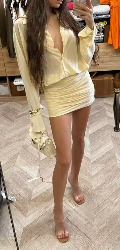 SEO Keywords: sheer mini dress, ruched mini dress, BAYU dress, black mini dress, yellow mini dress, women’s vacation dress, summer mini dress, long sleeve mini dress, luxury women’s fashion, Kimirey dresses