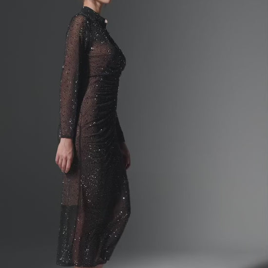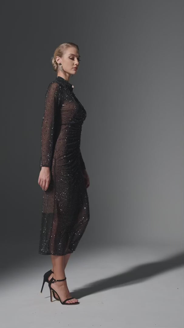 The sleek silhouette is elevated by a sculpted central tuck that flatters the figure and offers a flawless fit, while the shimmering crystal accents add high-impact glamour to your evening wardrobe. Whether you're attending a red carpet event, cocktail party, or elegant celebration, this sparkly midi dress guarantees a show-stopping moment.