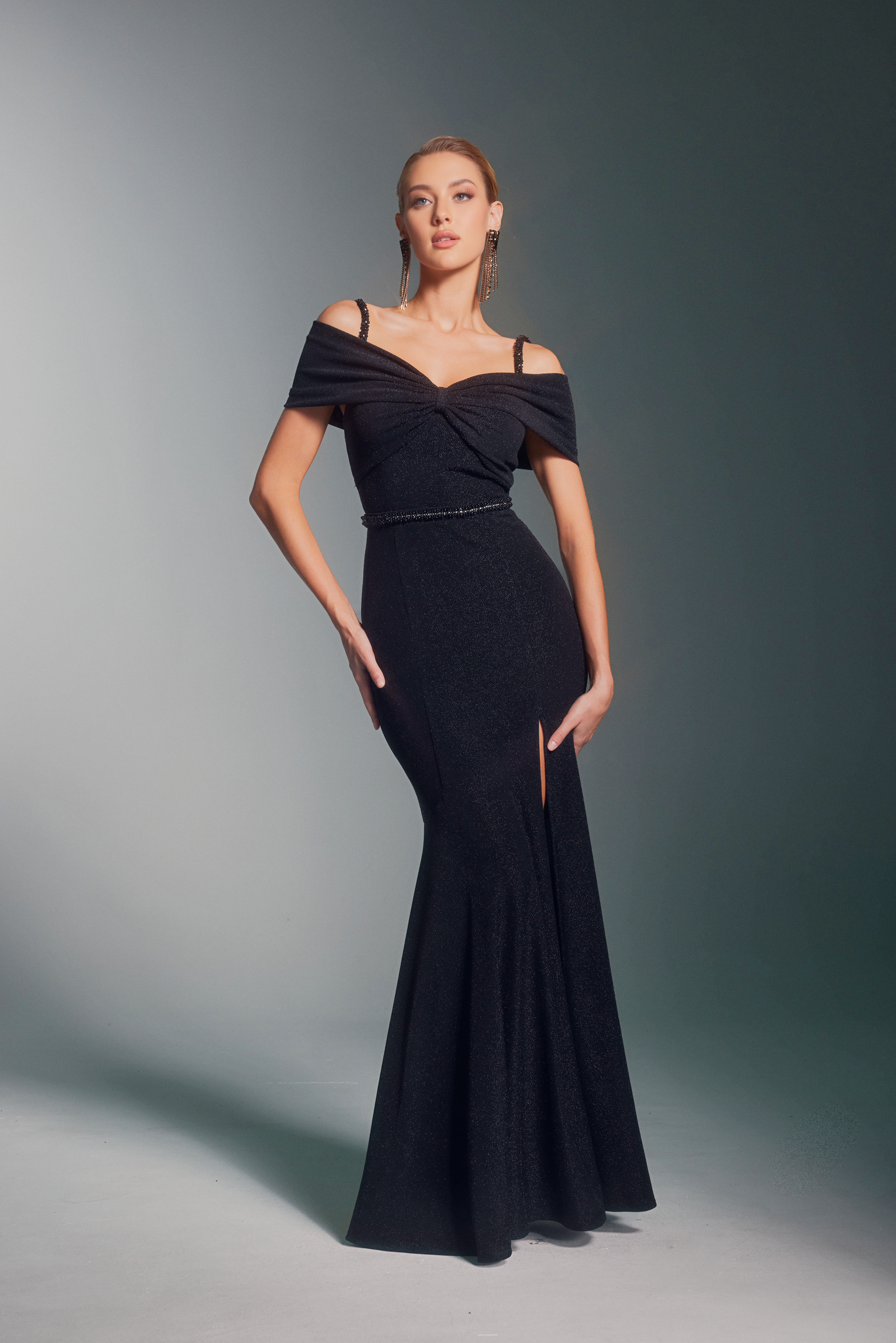 Keywords: KIMIREY x Anel Tashe, off-shoulder maxi dress, glitter evening gown, ruched neckline dress, rhinestone strap dress, fitted glitter dress, glamorous formal dress, stretch sequin gown, luxury event wear, detachable belt dress