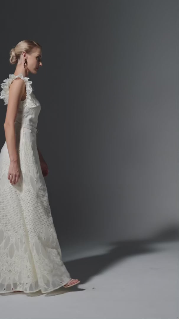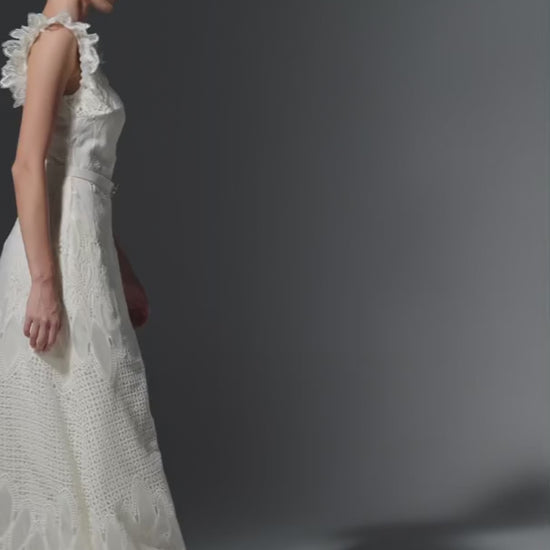 Keywords: KIMIREY x Anel Tashe, embroidered maxi dress, petal motif dress, sleeveless long dress, luxury designer dresses, statement belt dress, square neckline maxi, romantic evening dress, fashion-forward occasion wear
