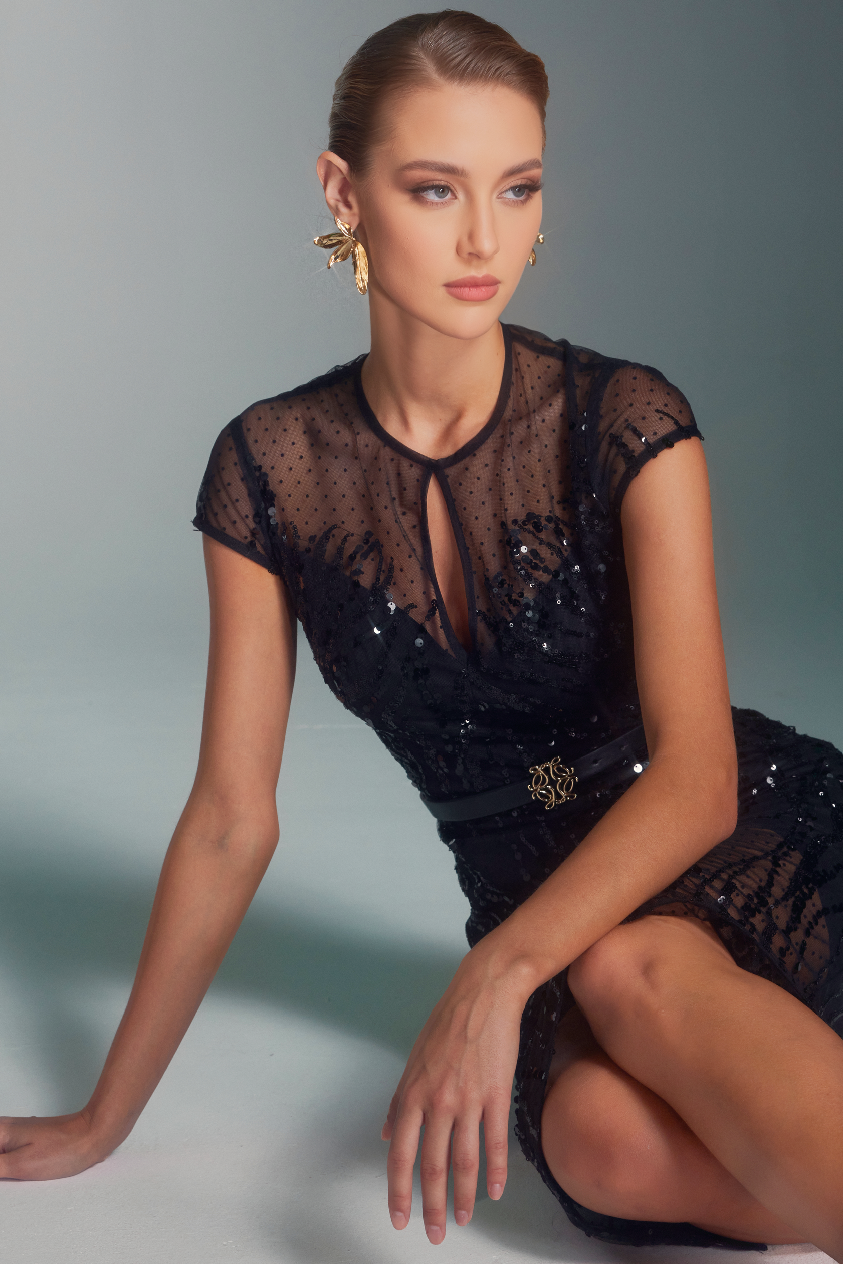 Keywords: KIMIREY x Anel Tashe, petals midi dress, pencil silhouette dress, textured midi dress, petal detail dress, black and pink midi dress, modern occasionwear, elegant cocktail dress, fashion-forward midi, logo belt styling