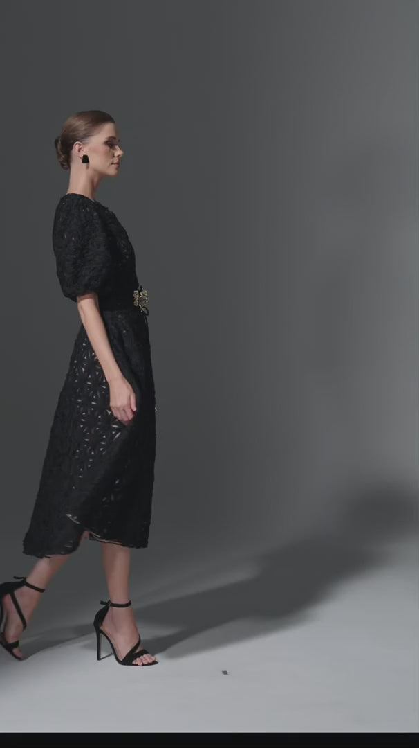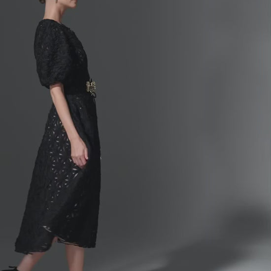 Keywords: KIMIREY x Anel Tashe, 3D flower dress, textured floral midi dress, puff sleeve dress, voluminous designer dress, flower belt dress, modern romantic dress, statement occasion wear, couture-inspired fashion